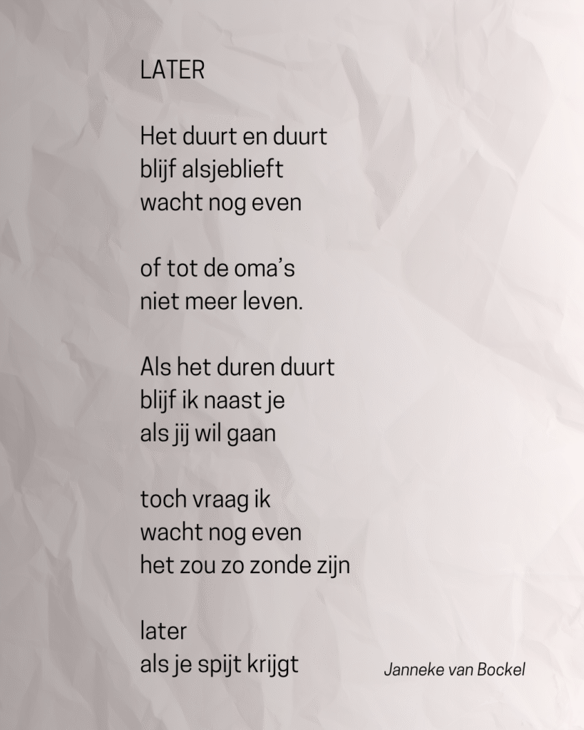 Lange tijd was het bij ons elke week suïcidepreventieweek. Paradoxaal genoeg bleek de dood bespreekbaar maken een belangrijke stap naar verbinding. Woest moeilijk – dat ook. Ik was heel blij dat ik met de module ‘Vraag maar’ van 113 geoefend had (zie vraagmaar.113.nl). Maar dan moet je nog wel het moment durven pakken…